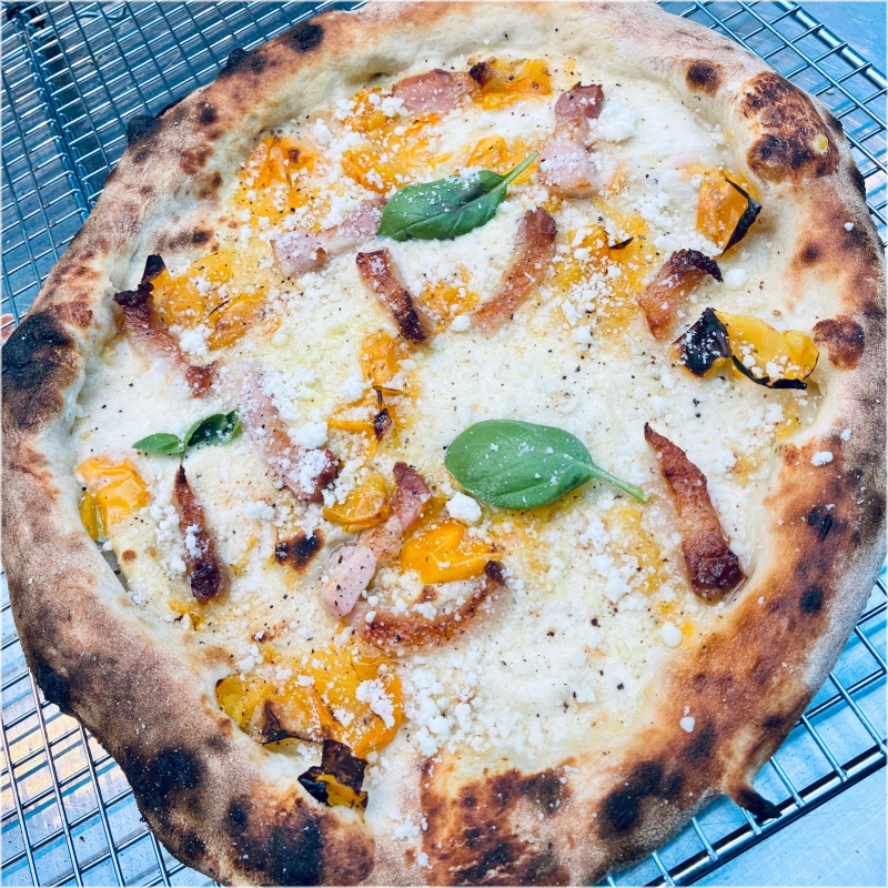 -Gele tomaatjes, pancetta, gerookte scamorza kaas, Parmigiano, pecorino, basilicum, peterselie;-Yellow cherry tomatoes, pancetta, smoked scamorza cheese, Parmigiano, pecorino, basil,parsley0